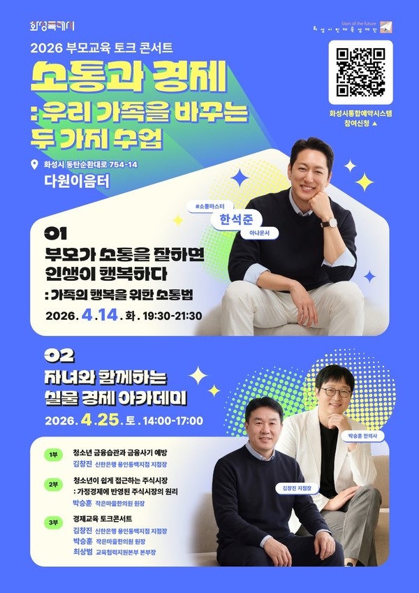 화성시인재육성재단(대표이사 임선일)은 2026년 부모교육 사업의 일환으로, 학부모와 자녀가 함께 참여하는 「소통과 경제: 우리 가족을 바꾸는 두 가지 수업」 토크콘서트를 운영한다. 토크콘서트는 가족 간 건강한 관계 형성을 위한 소통 교육과 자녀의 올바른 경제관 형성을 위한 경제교육을 주제로 구성되어, 대상별 맞춤형 프로그램으로 운영된다.