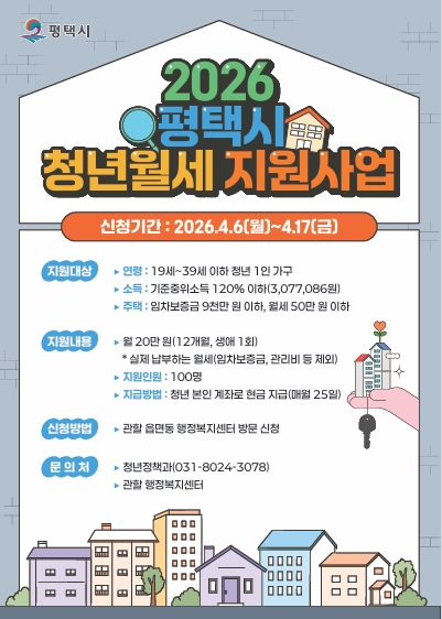 평택시(시장 정장선)는 관내 청년의 주거비 부담 완화와 사회진입 지원을 위해 ‘평택시 청년 월세 지원’ 사업 신규 대상자를 모집한다.