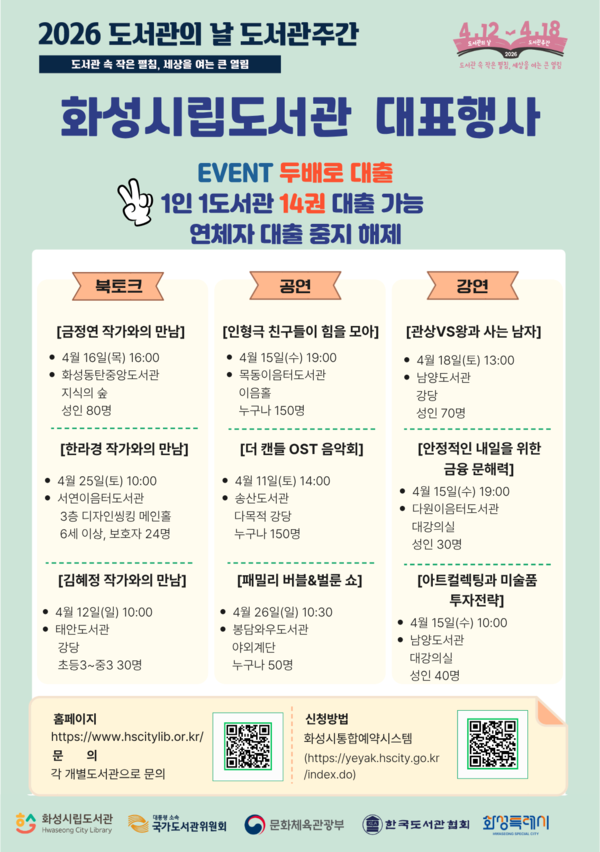화성특례시는 4월 12일 ‘도서관의 날’을 맞아 12일부터 18일까지 ‘2026년 도서관주간’을 운영하고, 시민을 위한 다채로운 독서문화 행사를 마련했다.