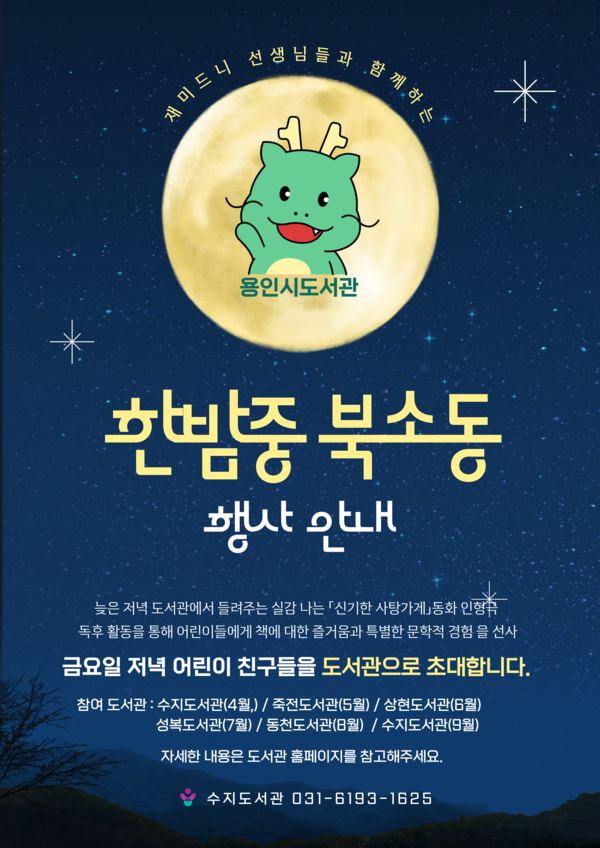 용인특례시(시장 이상일) 서부도서관은 수지‧죽전‧상현‧성복‧동천도서관에서 야간 독서문화 프로그램 ‘한밤중 북소동’을 운영한다고 25일 밝혔다.